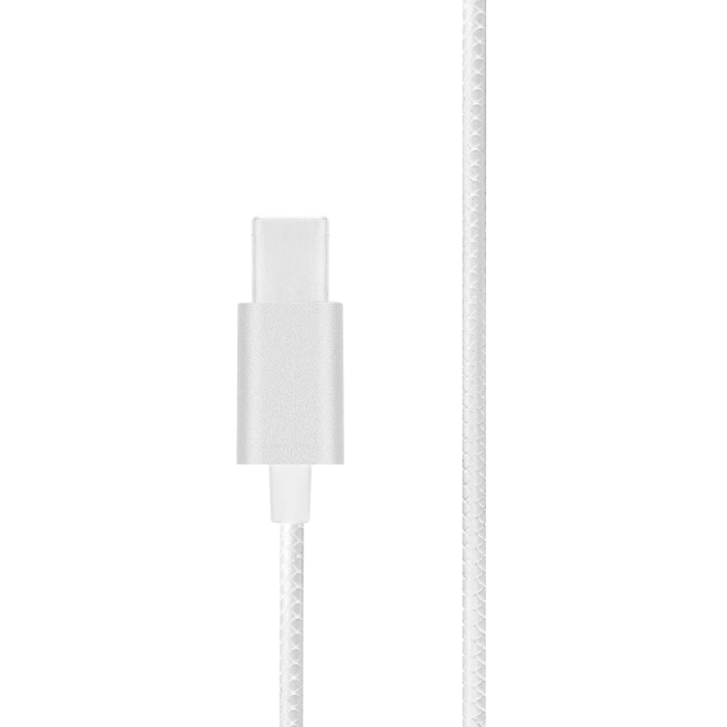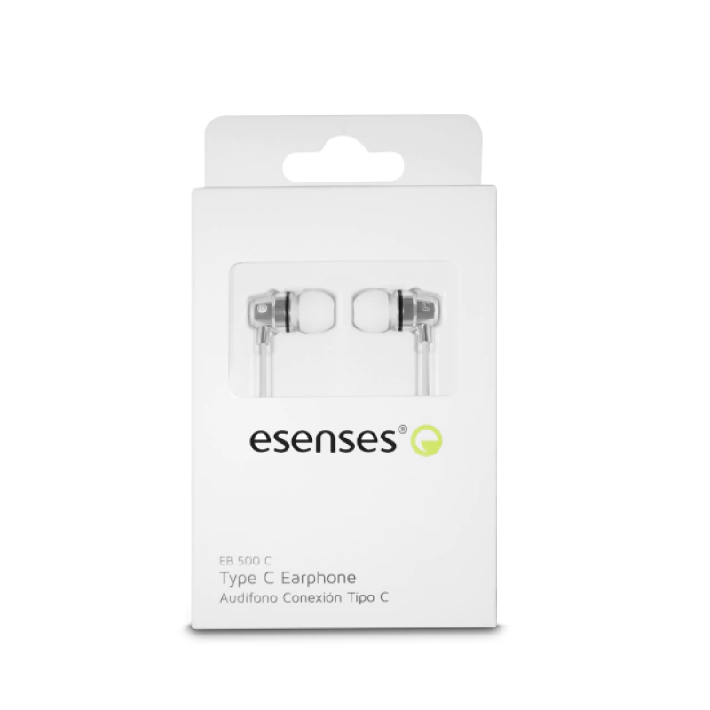 Audífono Esenses EB 500 Tipo C blanco con micrófono y controles integrados. Conexión directa a dispositivos con puerto USB-C. Diseño cómodo y sonido claro para uso diario